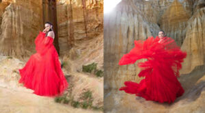 Devangi Wikramasinghe Featuring a custom couture creation designed by Venuka Wickramaarachchi for Devangi Wikramasinghe, captured in an iconic outdoor fashion editorial. The flowing scarlet tulle gown embodies drama, freedom, and
