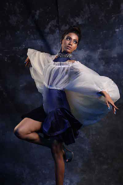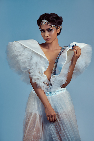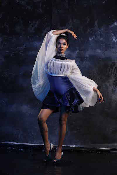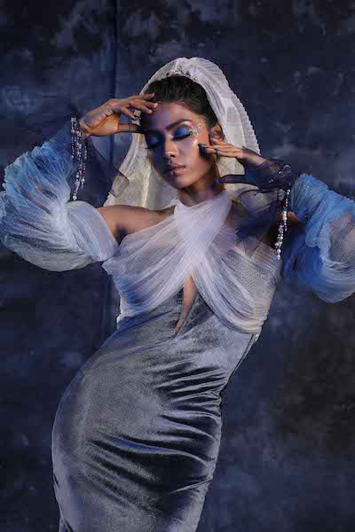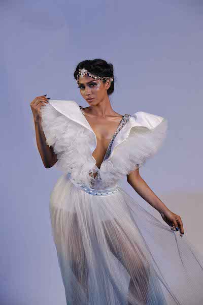The Evergrace collection represents a dialogue between heritage and haute couture, blending Sri Lankan craftsmanship with European runway aesthetics. The featured gown worn by Harini embodies poise, fluidity, and modern romanticism, crafted in rich fabrics with sculptural draping and intricate detailing that reflect the depth of Venuka’s creative identity.